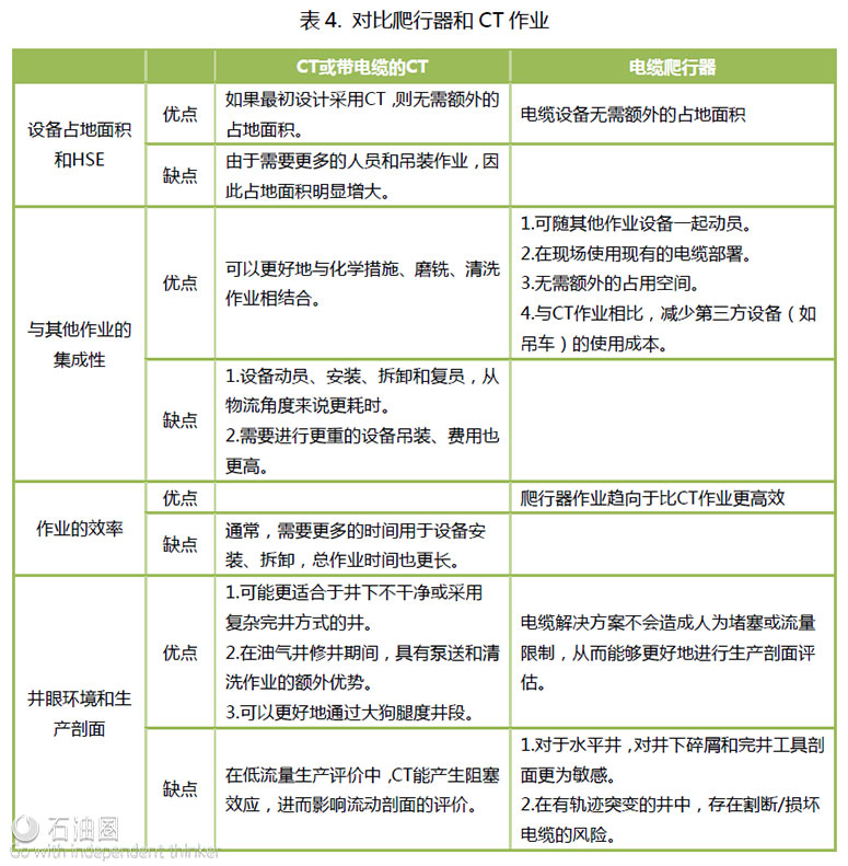 The advantages of the e-line tractor are its modularity, combinability, and light weight. It is transported to the well site easily and rigged up within a small footprint and with minimal interference in other operations at the well site. In specific jobs, the tractor operations can provide a superior well intervention strategy from a health, safety and environmental (HSE) and operational efficiency perspective. Table 4 compares CT operations to e-line tractor operations.