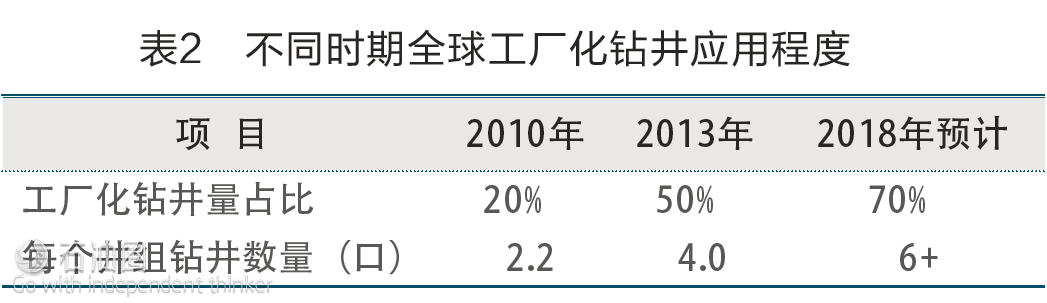 全球最大的陆上钻井承包商Nabors国际公司的报告认为,2018年工厂化钻井(Pad Drilling)数量将占陆上钻井量的70%,平均每个井组所钻井数也将从2010年的2.2口升至6口以上(见表2)。
