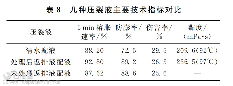 实验结果表明,未经过处理的返排液配制的压裂液综合性能比较差,只有增黏效果,加入交联剂后形成的冻胶无法挑挂,不能满足施工要求。用处理过的返排液配制的压裂液溶胀速率和耐温性能均好于清水配制的压裂液。