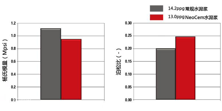 NeoCem cement presents a higher compressive strength (far left) plus up to a 30% ratio improvement (near left) between Compressive Strength (high for NeoCem Cement) and Young’s Modulus (low for NeoCem Cement) in spite of a density lower than the comparative conventional cement. These results indicate a significantly greater probability for NeoCem cement rather than conventional cement to withstanding cyclic loads from pressure events and resist cracking. NeoCem cement exhibits a lower Young’s modulus (far left) and a higher Poisson’s Ratio (near left), demonstrating greater ductility and thus a higher probability of resisting deformation due to casing expansion / contraction.