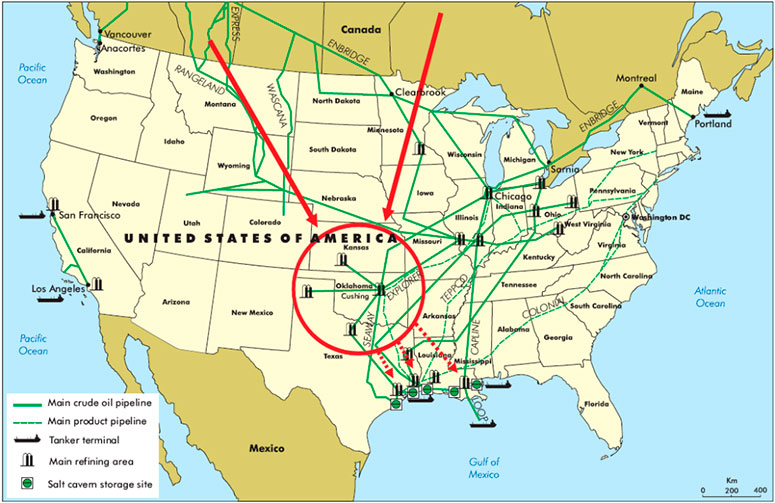 Cushing, Oklahoma is the largest oil-storage tank farm in the world. It has 73 million barrels of working capacity, about 13% of total U.S. storage. Several important oil pipelines converge there as oil moves from production sites to refineries on the Gulf Coast (Figure 3).