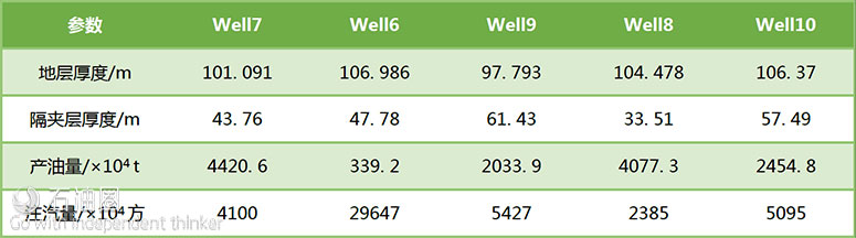Well7井和Well8井隔夹层厚度相对最小,注气量最少,但是产油量最多,而其余3口井的情况恰恰相反。这主要是随着隔夹层厚度的增大,蒸汽驱的热效率逐渐降低,同时注汽井和采油井之间的注采对应关系逐渐变差所致。从该井组生产实践说明,隔夹层对于稠油热采储层生产具有十分重要的控制和影响作用。