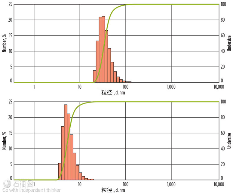纳米微粒分散的动态光散测量表明,微粒尺寸远小于大多数储层内的典型孔隙与孔隙孔喉尺寸(孔隙尺寸通常为几微米),如图2。