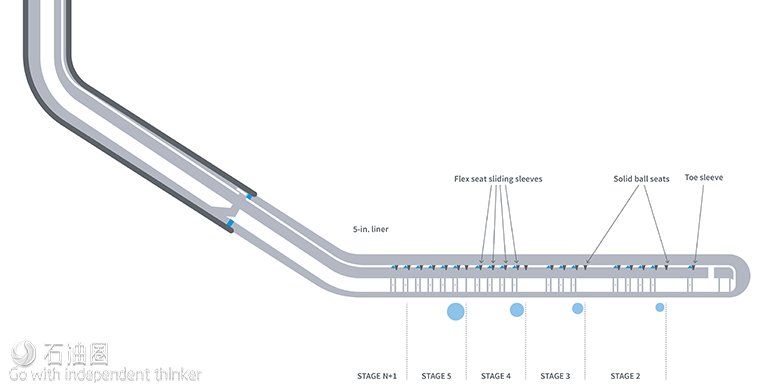 A 3 ⅜-in. ball was dropped to open the 19 sleeves in the lower stage, with the ball landing in the lower seat and providing isolation to the lower perforations during the acid matrix stimulations. Subsequently, a 3 ⅝-in. ball was dropped to open the 20 sleeves in the upper stage. The ball landed in the lower seat of the upper stage and provided isolation of the previous stage during the acid stimulation. Repeating this process yielded individual stimulation for each stage. Additionally, a good water-hammer effect was seen immediately after hard shutdown, indicating proper stimulation. High oil production with very little drawdown was encountered in both stages of the completion, as well as increased operational efficiency and a reduced need for intervention operations.