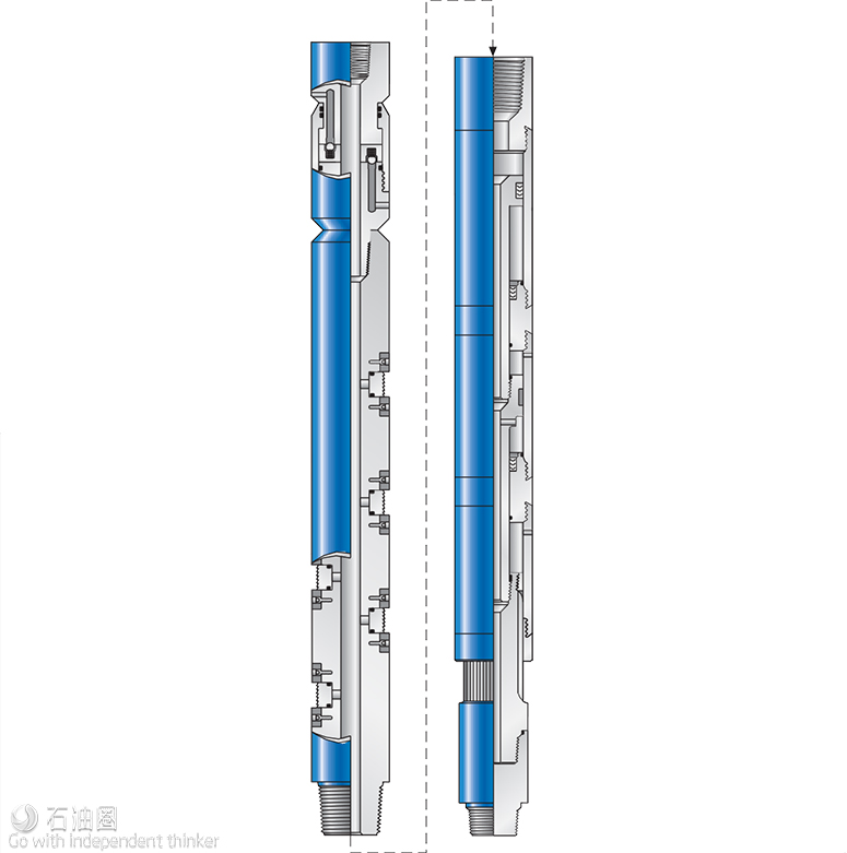 (3)The relief valve provides a means to bleed off the well fluid, as the pipe is pulled out of the hole. For smaller size tools, the valve is run on top of the tool and allows for release of the slips if differential pressure exists. For the largest tools, the relief valve is run at the bottom and provides a means to pressure up and activate the tool, opening after pressure is released without dropping any balls or darts from surface.
