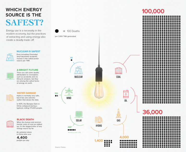 而对于清洁能源-核能来说,由于前苏联统治下乌克兰境内切尔诺贝利和日本福岛核危机的影响,一提起核能,可能我们的第一反应就是危险。然而,今年5月Cambridge House International给出的数字,可能会让我们大吃一惊——最安全的能源是核能。