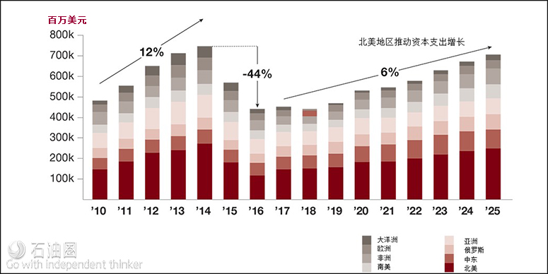 更广泛地说,全球上游资本支出在2014 – 2016年间下降了近45%,现在预计中期内将每年同比增长6%。在北美市场的推动下,油气钻井平台的作业量正在增加,大型项目正在获批。