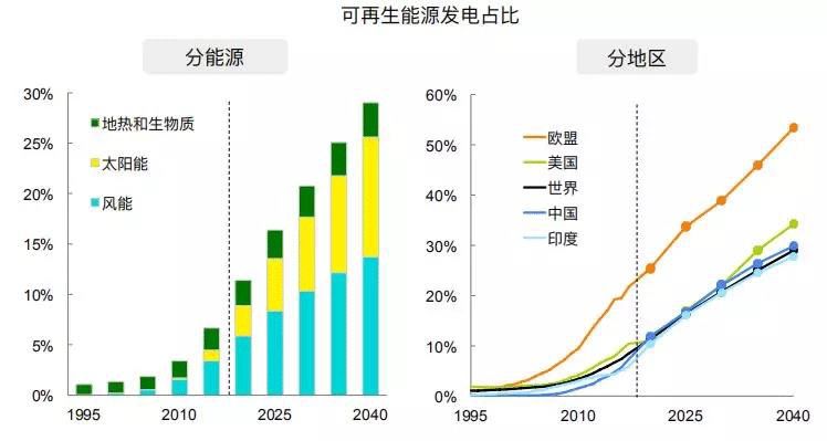 ▪85%的能源供给增长来自可再生能源和天然气。到2040年,可再生能源将成为全球最大的发电用能源。