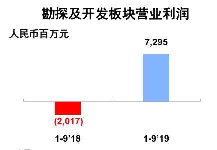 前三季度实现油气当量产量341.74百万桶,同比上涨1.9%。勘探及开发板块盈利大幅改善,前三季度实现盈利72.95亿元,与去年同比扭亏为盈。去年同期亏损20.17亿元。