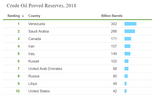 据美国能源信息管理局(EIA)发布,截至2018年,全球原油探明储量TOP10国家排名是: