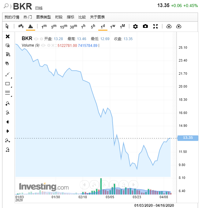 2016年5月2日贝克休斯股价显示为49美元,昨日其收盘价为13.35美元