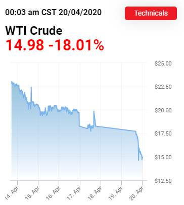 美国西德克萨斯中质原油(WTI)跌至1999年以来最低水平。据Oilprice官网显示,美东时间周日WTI跌破15美元,最低至14.54美元,日内跌幅超20%。目前价格为14.98美元。相比之下,布伦特原油期货价格最低至每桶26.91美元,跌幅4%。