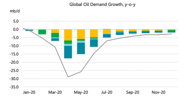 2020年1月至11月全球石油需求负增长预测曲线。灰色曲线代表全球需求变化情况,黄柱代表欧洲的需求变化、绿柱代表中国、浅蓝色代表印度、深蓝绿色代表美国。